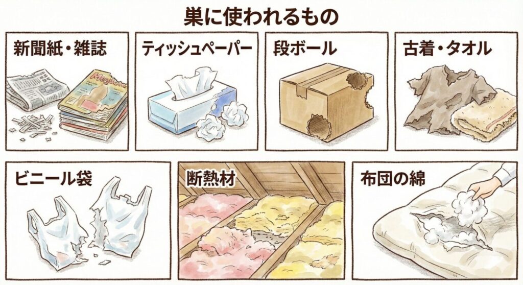 ネズミは巣作りのために様々なものを利用します。